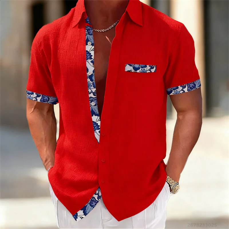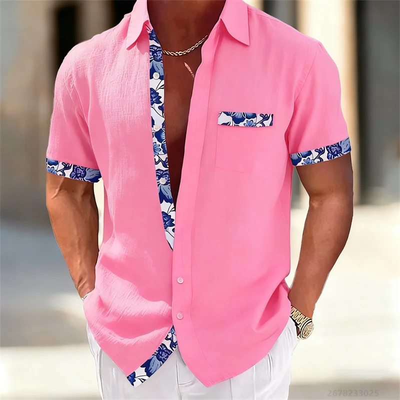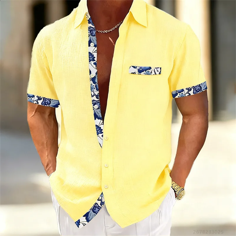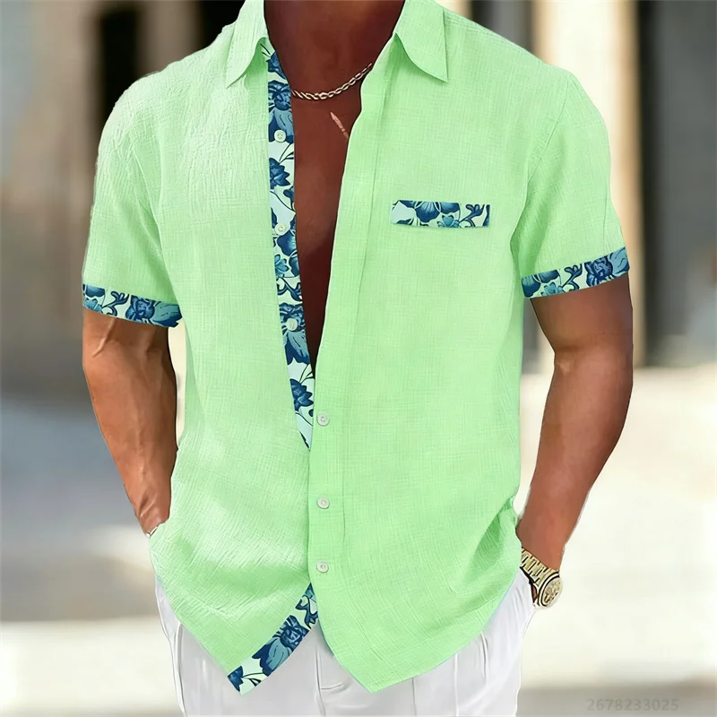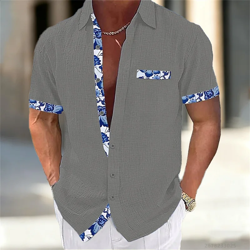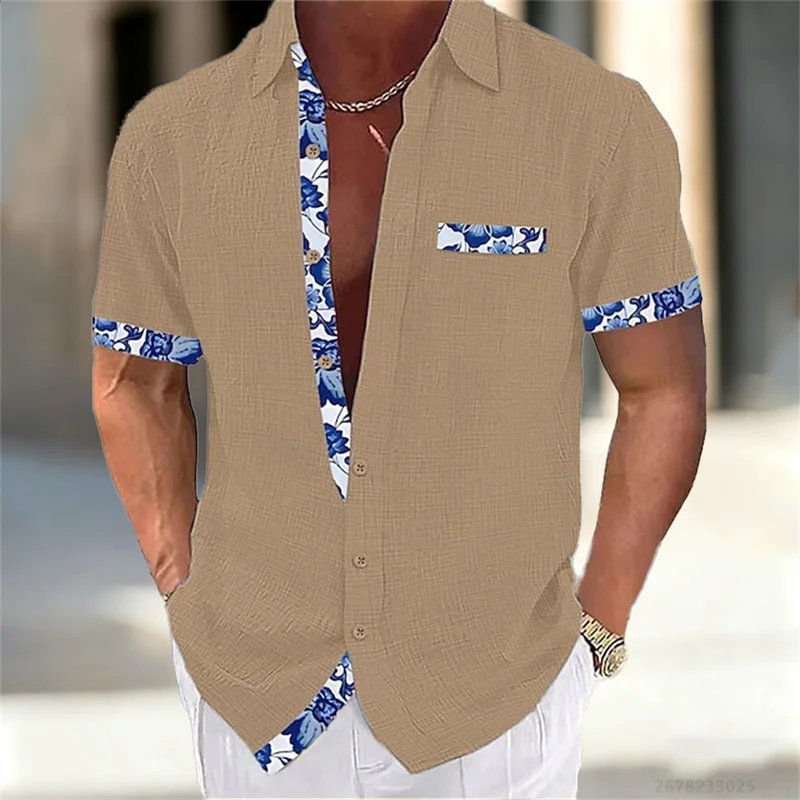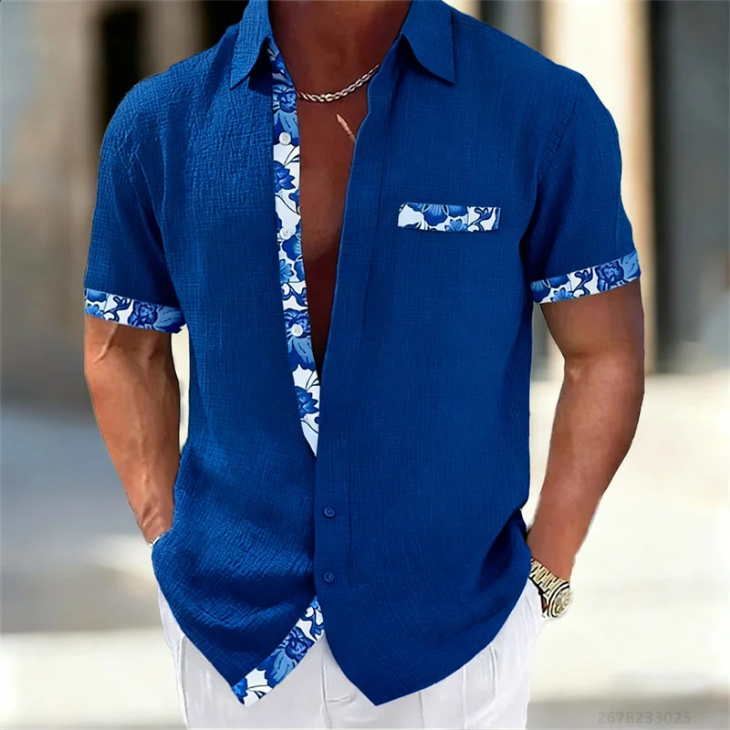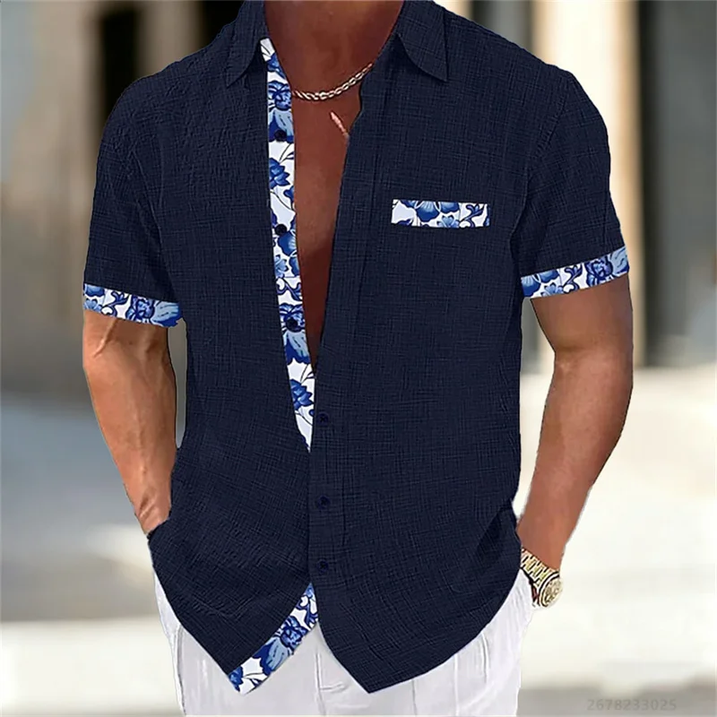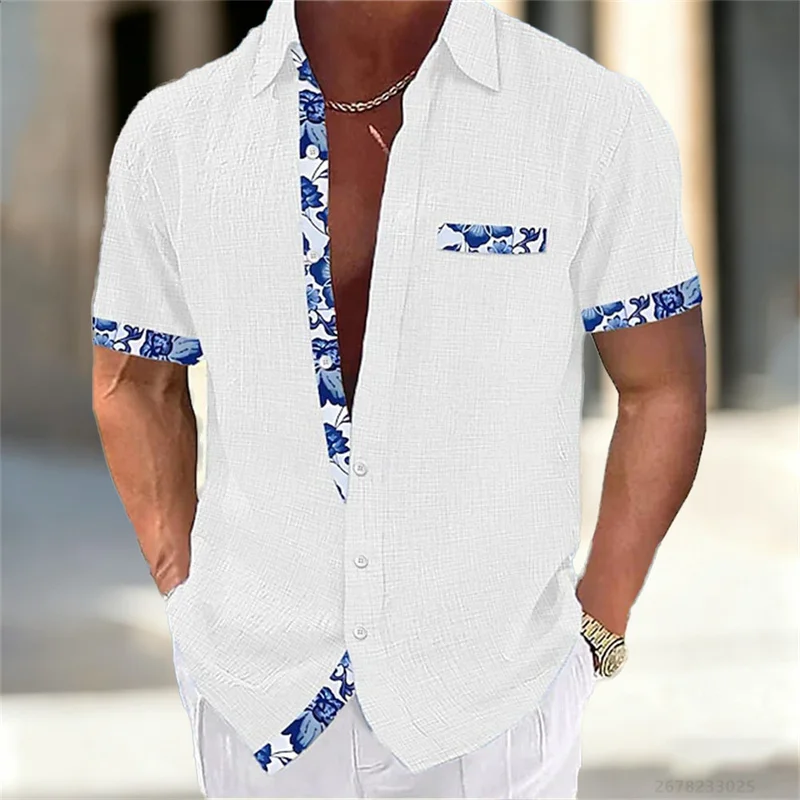 Camicia da uomo a maniche corte con patchwork in porcellana blu e bianca retrò, camicia casual in cotone e lino traspirante, vestibilità ampia, taglie dalla XS alla 6XL
