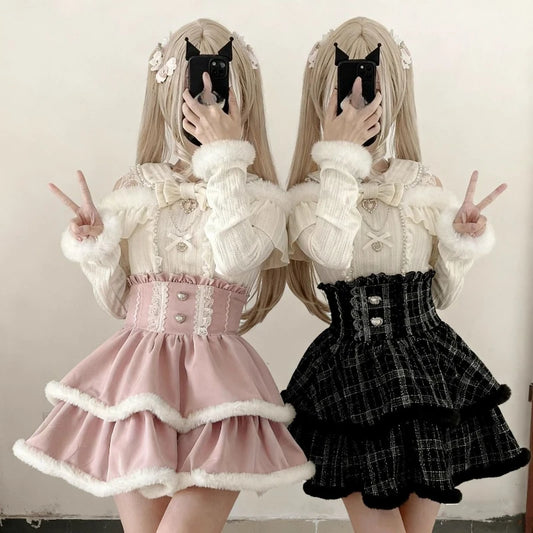 Abiti da Lolita Kawaii per ragazze giapponesi, camicette con fiocco in maglia e gonne a vita alta, nuovi adorabili set da 2 pezzi Harajuku invernali