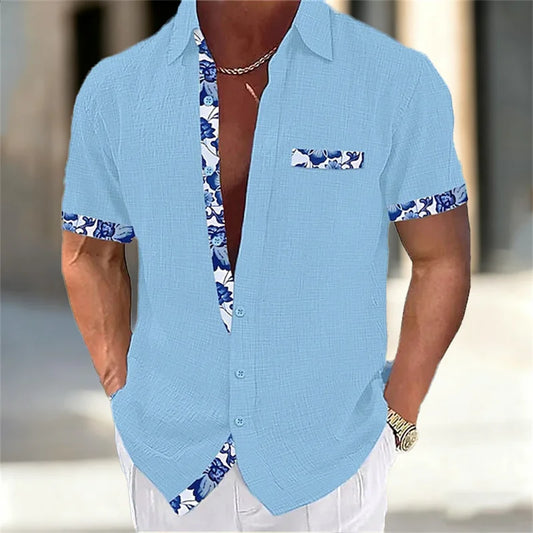 Camicia da uomo a maniche corte con patchwork in porcellana blu e bianca retrò, camicia casual in cotone e lino traspirante, vestibilità ampia, taglie dalla XS alla 6XL